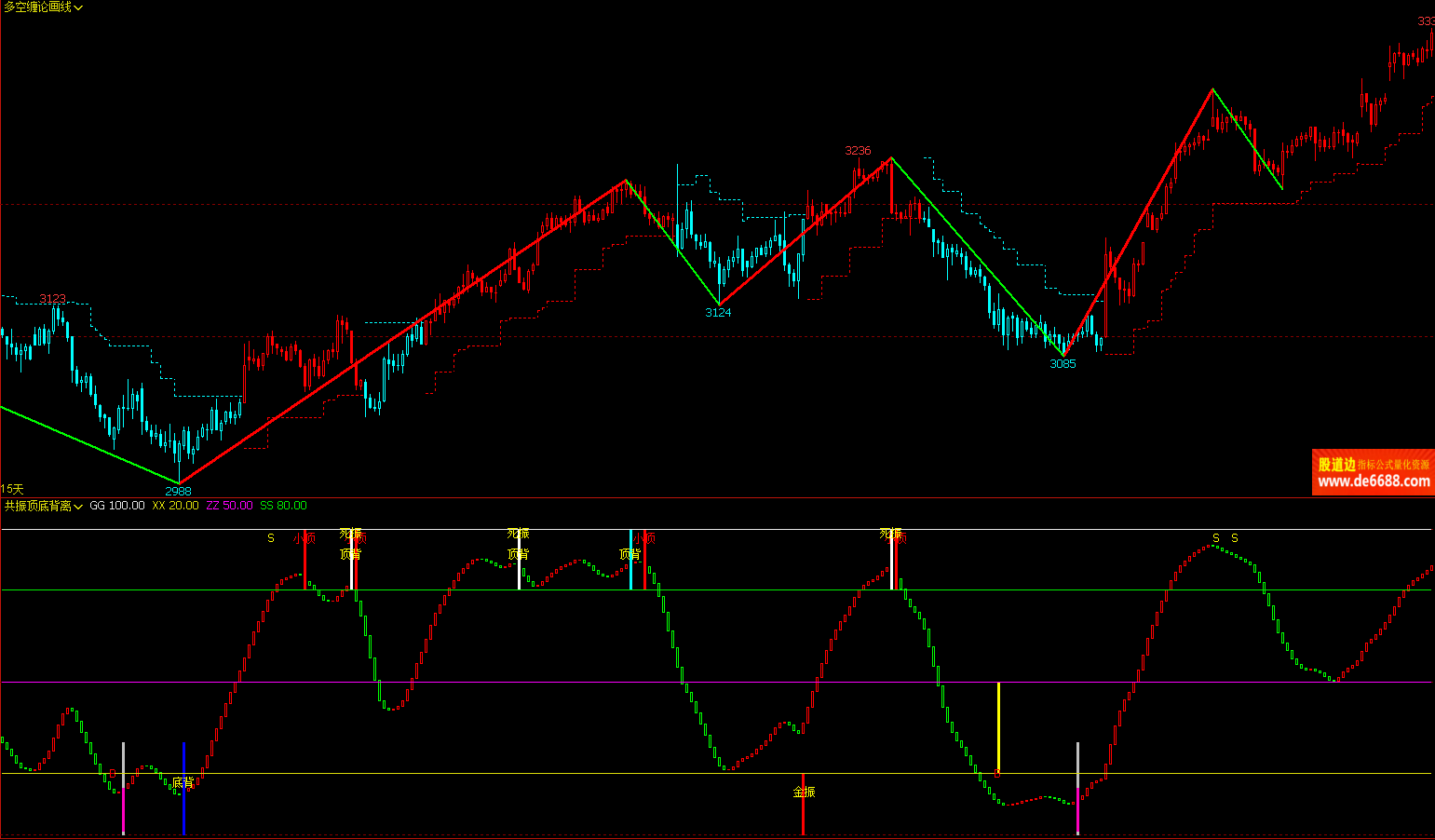 文华财经WH6 共振顶底背离副图公式 顶底提示 附图指标源码 加密无时限
