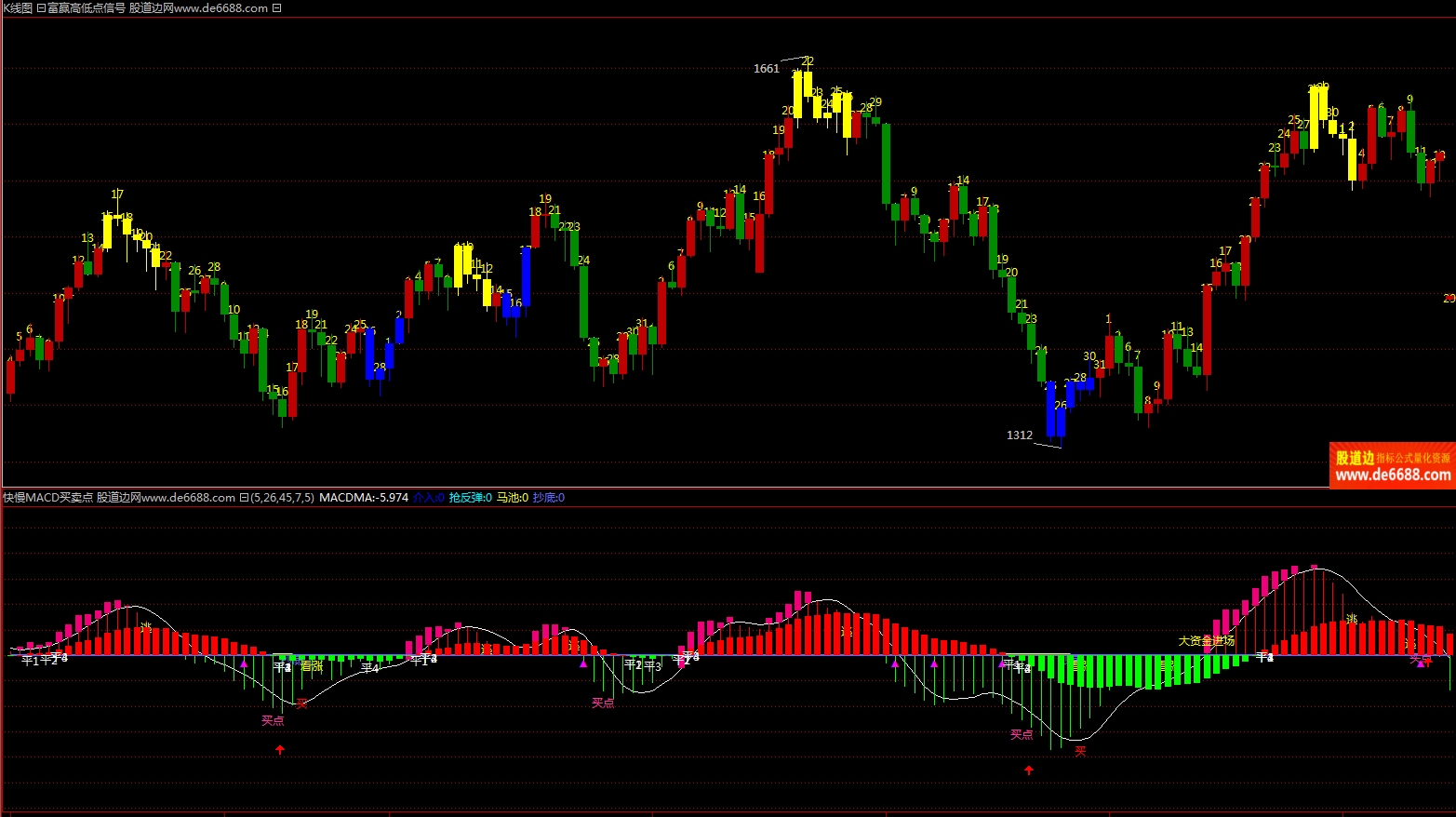 倚天财经软件 富赢高低点信号主图公式 蓝黄顶底K线 主图指标源码 加密无时限