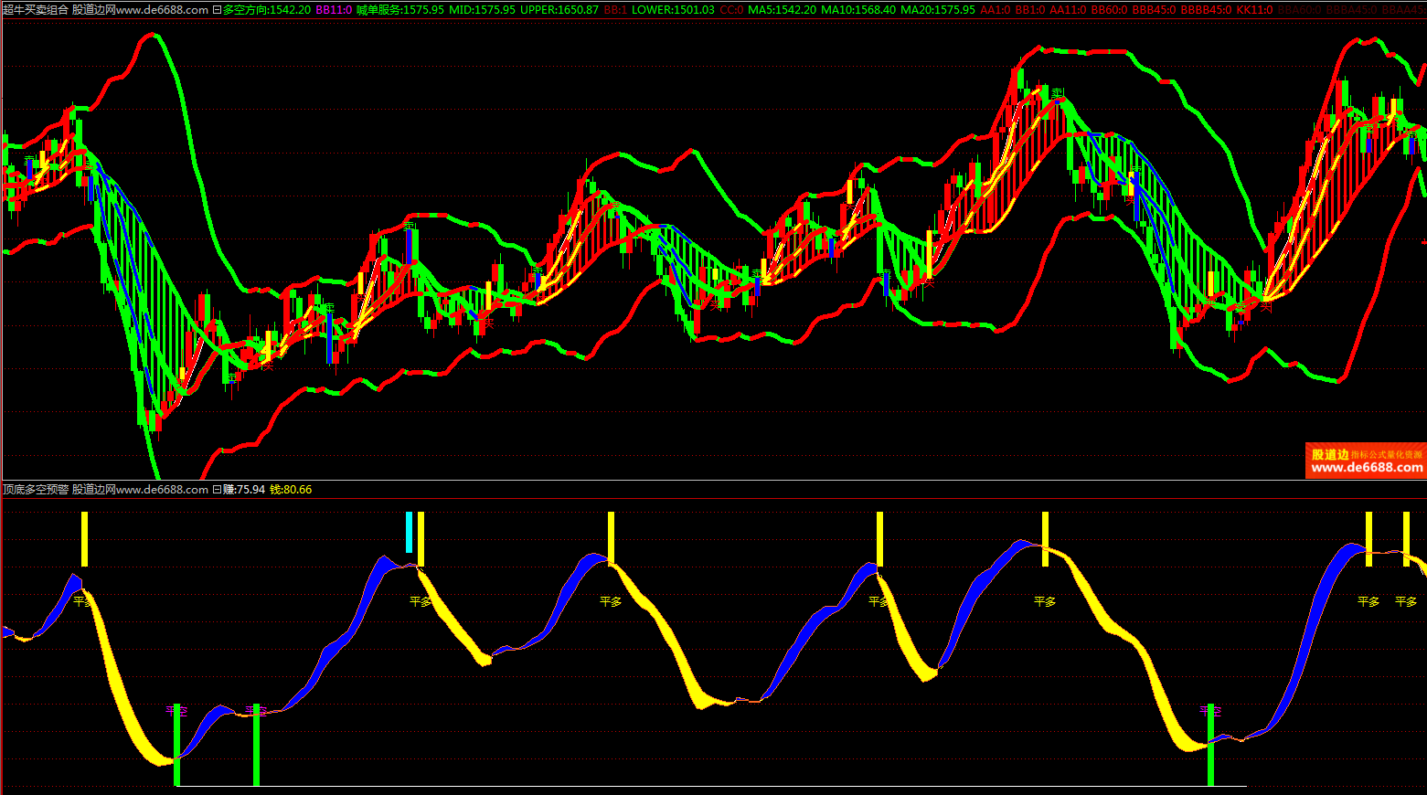 倚天财经软件 超牛买卖组合主图公式 多空变色趋势 主图指标加密无时限
