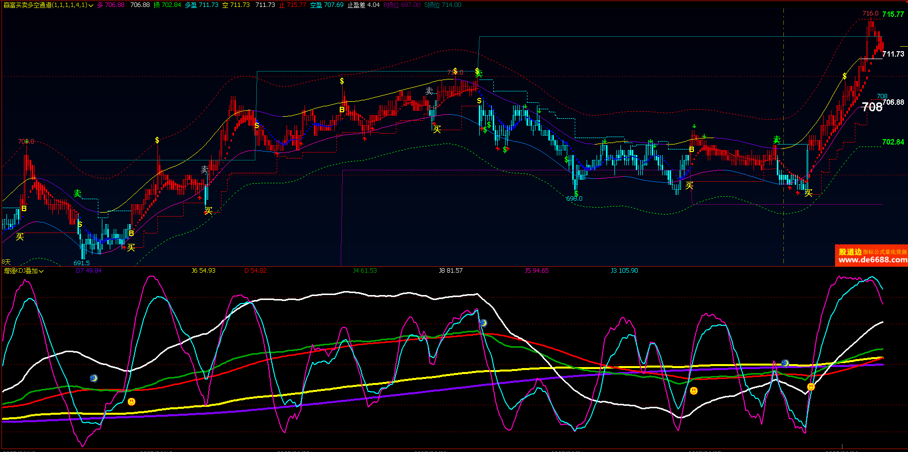 文华财经WH6 增强KDJ叠加副图公式 多空图标提示 附图指标源码 加密无时限