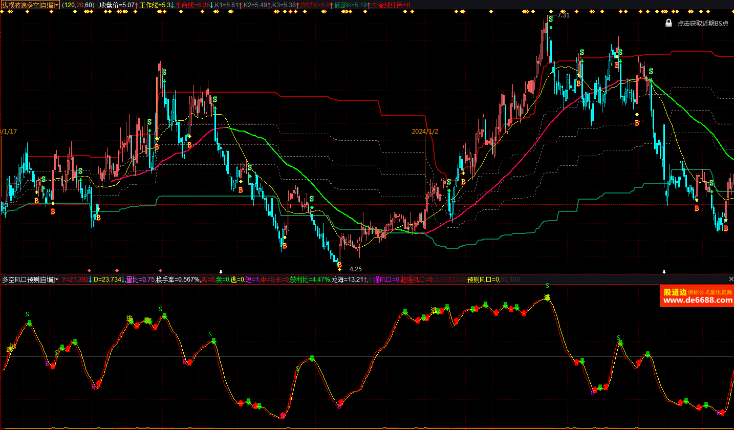 益盟操盘手软件指标 多空风口预测副图公式 换手 量比 附图源码加密无限制