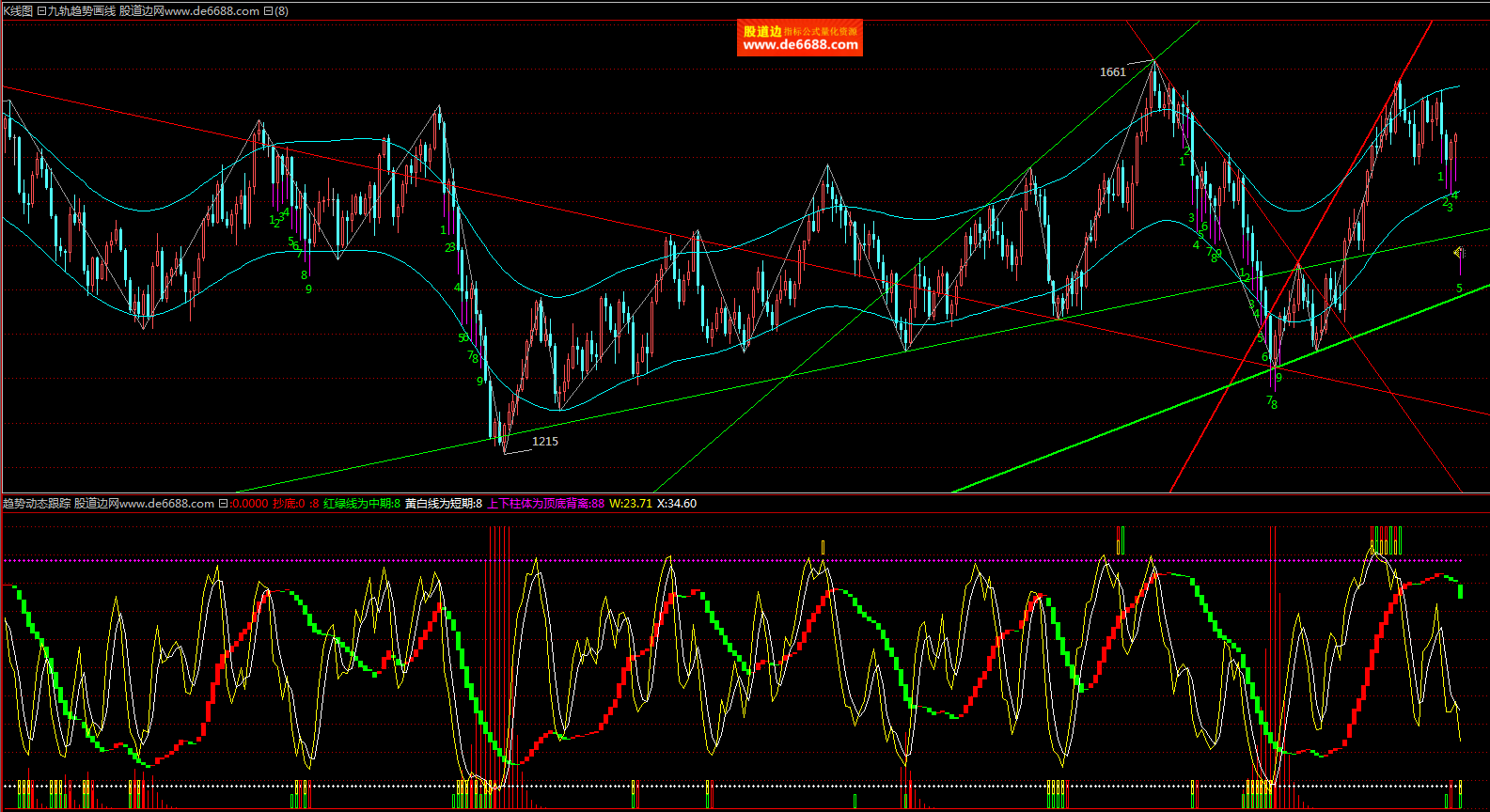 倚天财经软件 九轨趋势画线主图公式 支撑压力线 主图指标源码加密无时限