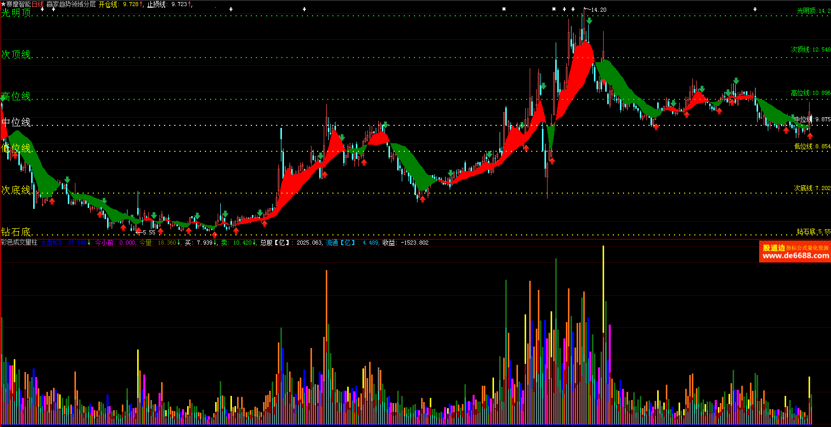 大智慧软件 彩色成交量柱副图公式 流通 收益 附图指标源码 加密无时限