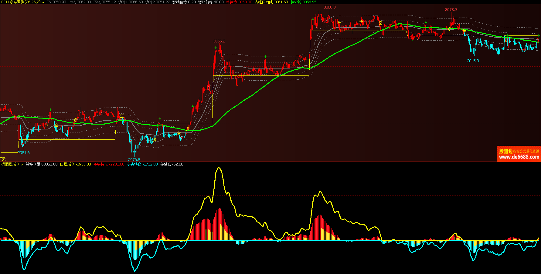 文华财经WH6 BOLL多空通道主图公式 布林多空点提示 主图指标源码 加密无时限