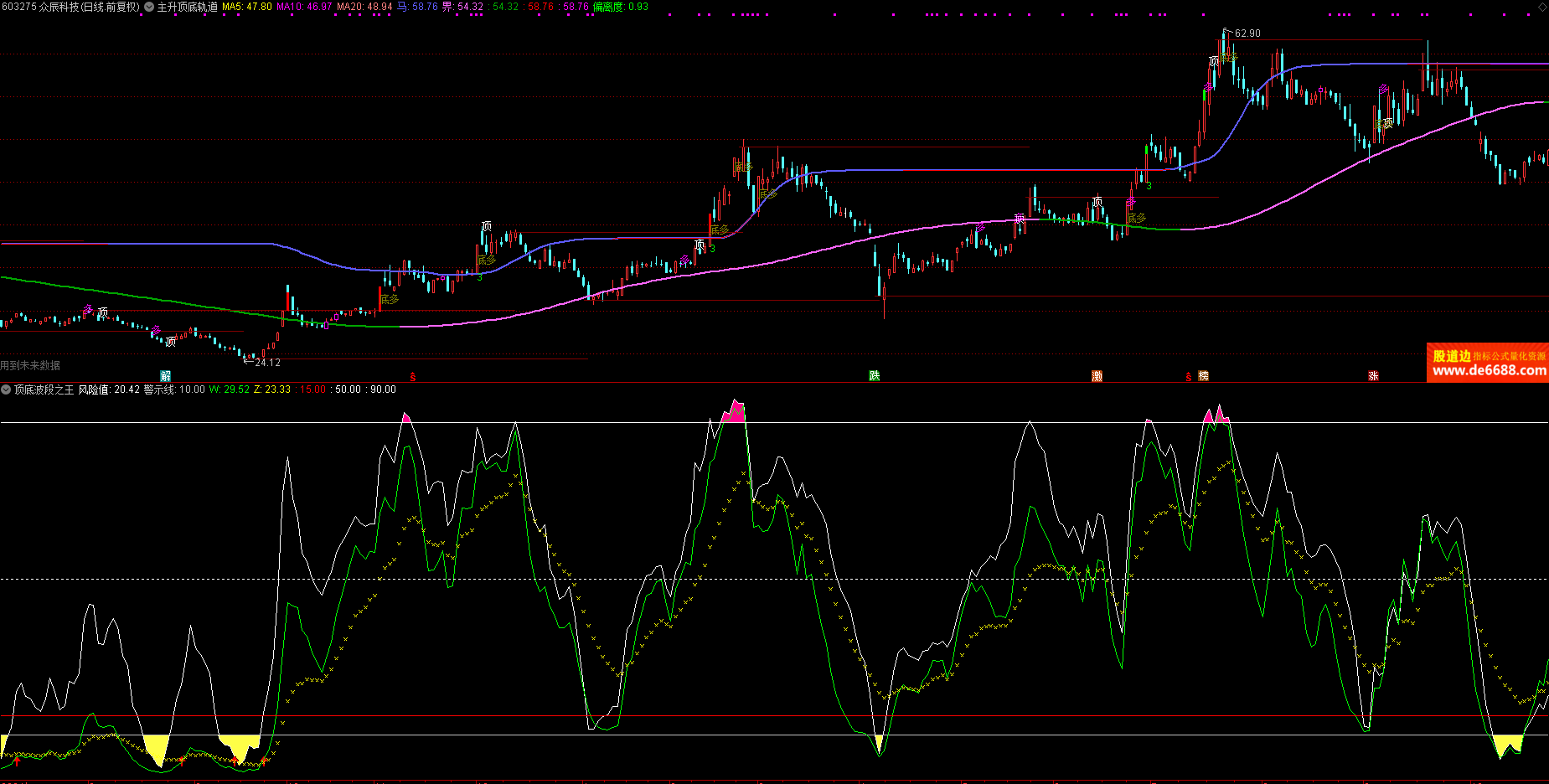 通达信软件使用 顶底波段之王副图公式 顶底色区提示 附图指标源码