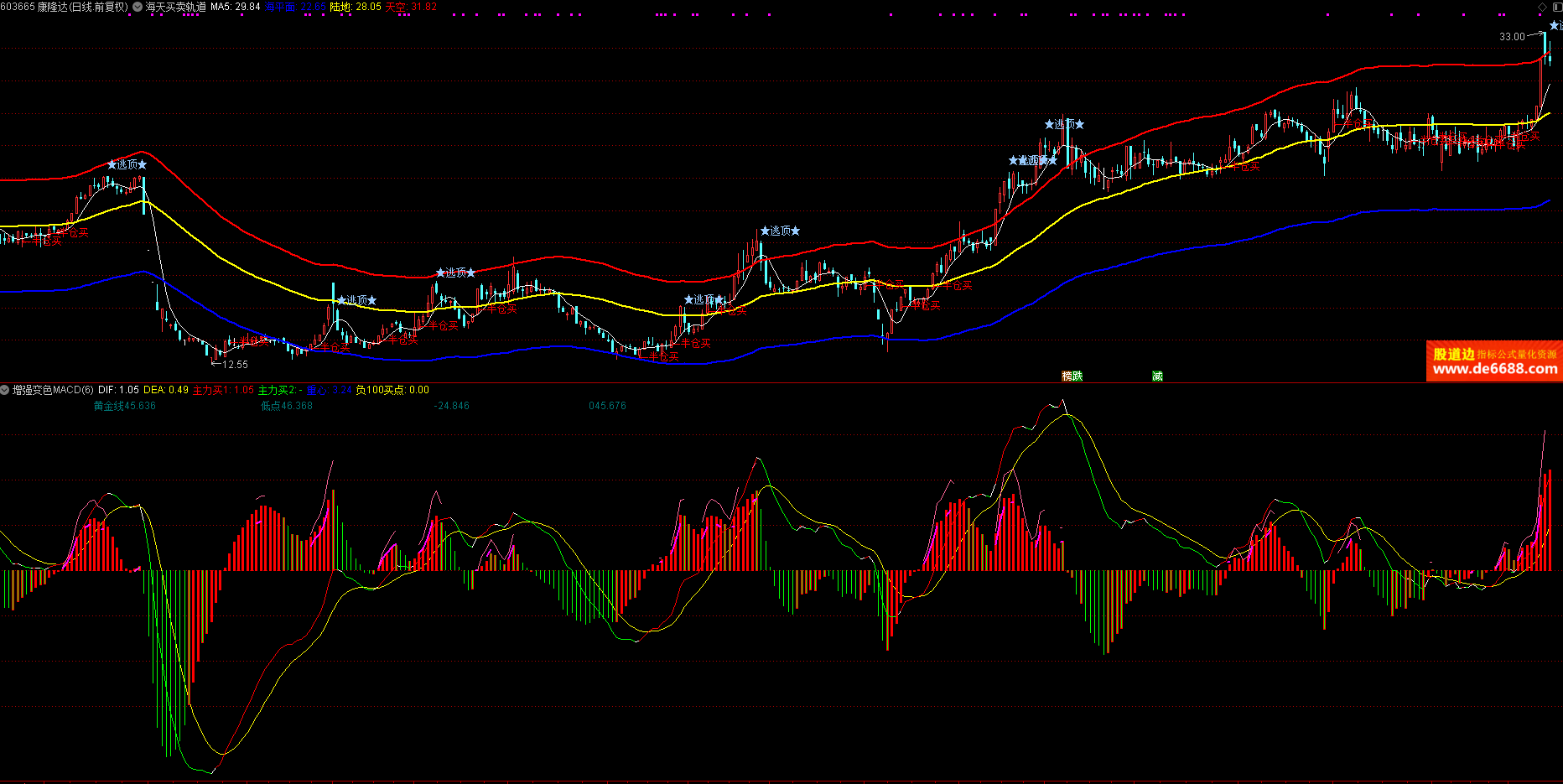 通达信软件使用 海天买卖轨道主图公式 仓位买 逃顶提示 主图指标源码